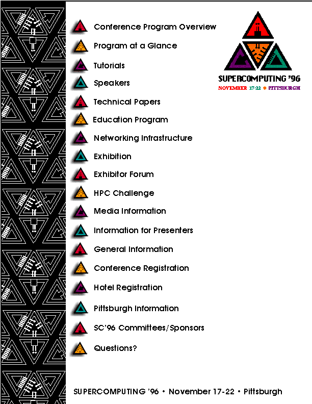 SC'96 Home Page | Conference Program Overview | Tutorials | Keynote/Plenary/Invited Speakers | Technical Papers | Education Program | Networking Infrastructure | Exhibits | Exhibitor Forum | HPC Challenge | Media Information | Information for Presenters | General Information | Conference Registration | Hotel Registration | Pittsburgh Information | SC'96 Committees | Questions? |